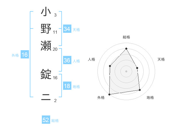 小野瀬 錠ニさんを姓名の画数から五運を鑑定