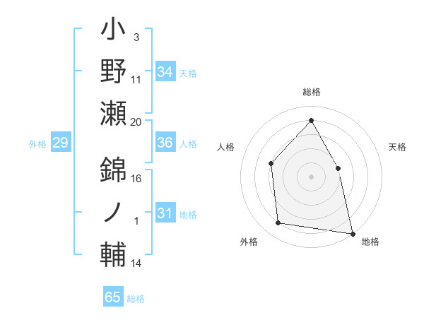 小野瀬 錦ノ輔さんの総格は65画の4点!