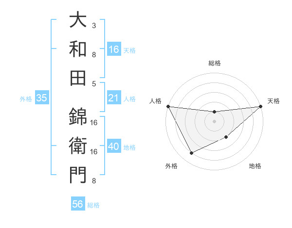 大和田 錦衛門さんの天格は16画の5点!