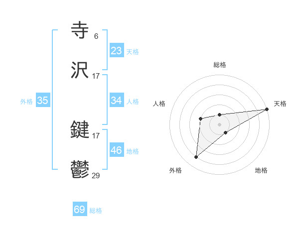 寺沢 鍵鬱さんの総格は69画の1点!