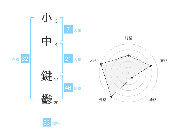 小中 鍵鬱さんの総格は53画の3点!