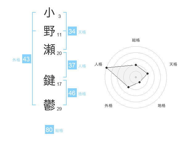 小野瀬 鍵鬱さんを姓名の画数から五運を鑑定