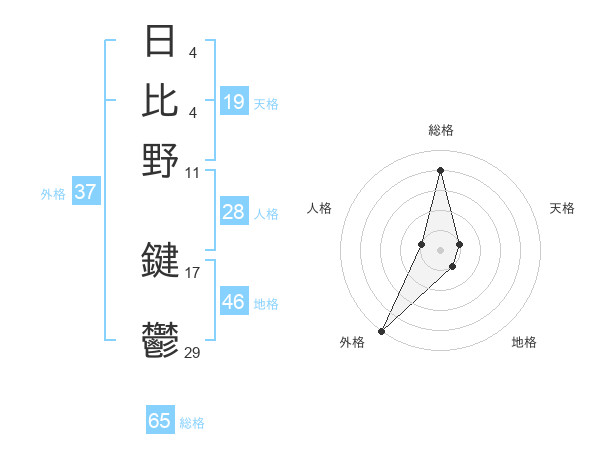 日比野 鍵鬱さんの総格は65画の4点!