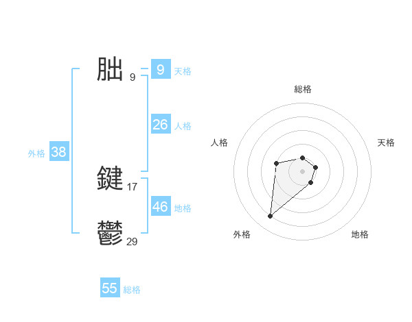 朏 鍵鬱さんの総格は55画の1点!