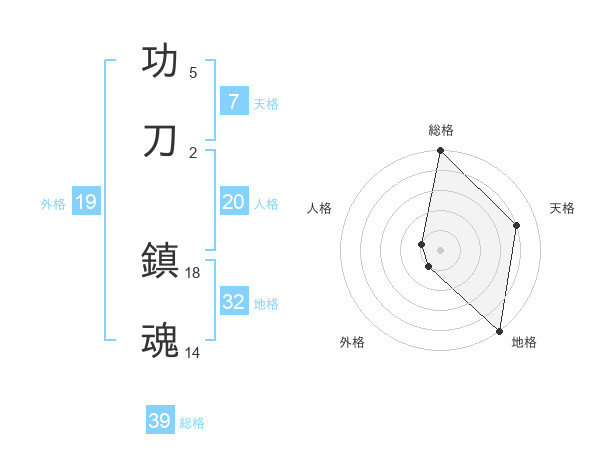 功刀 鎮魂さんの総格は39画の5点!