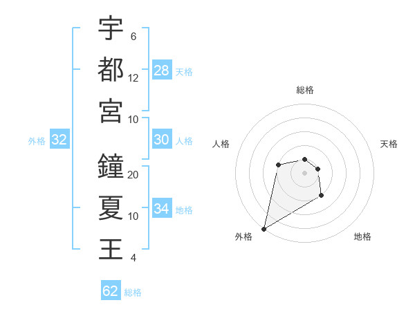 宇都宮 鐘夏王さんの外格は32画の5点!