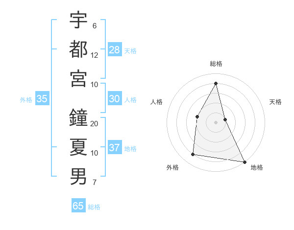 宇都宮 鐘夏男さんの総格は65画の4点!