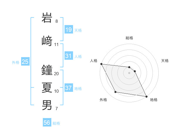 岩﨑 鐘夏男さんの地格は37画の5点!