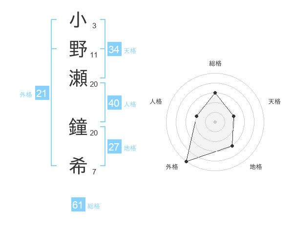小野瀬 鐘希さんの総格は61画の3点