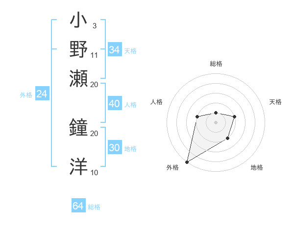 小野瀬 鐘洋さんの総格は64画の1点!