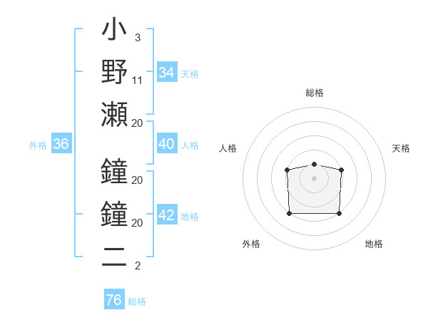 小野瀬 鐘鐘二さんの総格は76画の1点!
