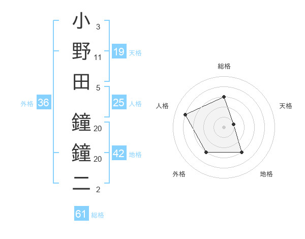 小野田 鐘鐘二さんの総格は61画の3点!