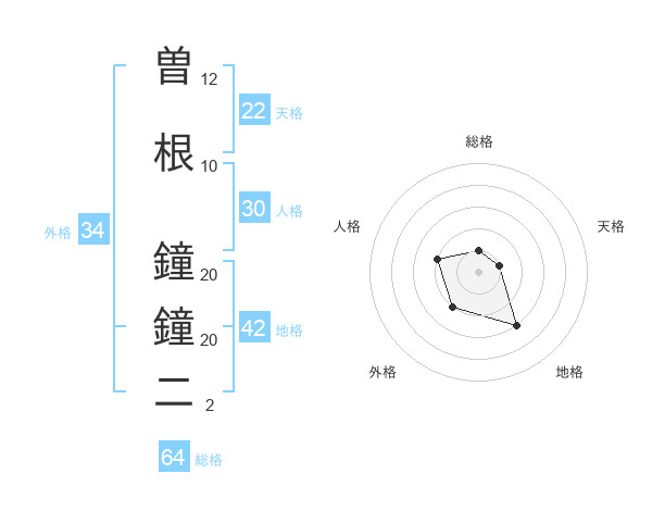 曽根 鐘鐘二さんの総格は64画の1点