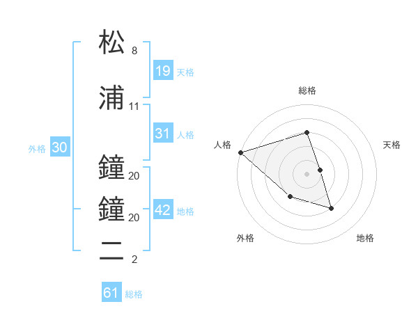 松浦 鐘鐘二さんの総格は61画の3点!
