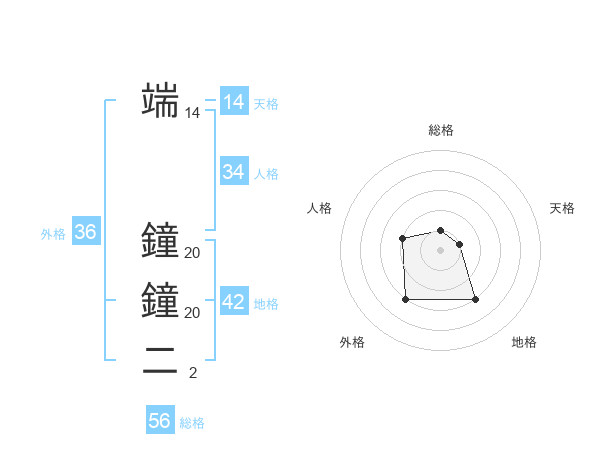 端 鐘鐘二さんの総格は56画の1点!