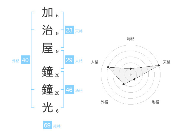 加治屋 鐘鐘光さんの天格は23画の5点!