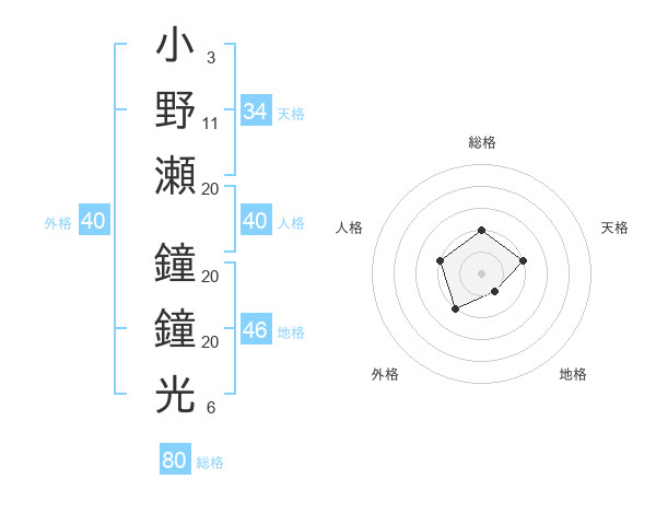 小野瀬 鐘鐘光さんの総格は80画の2点!