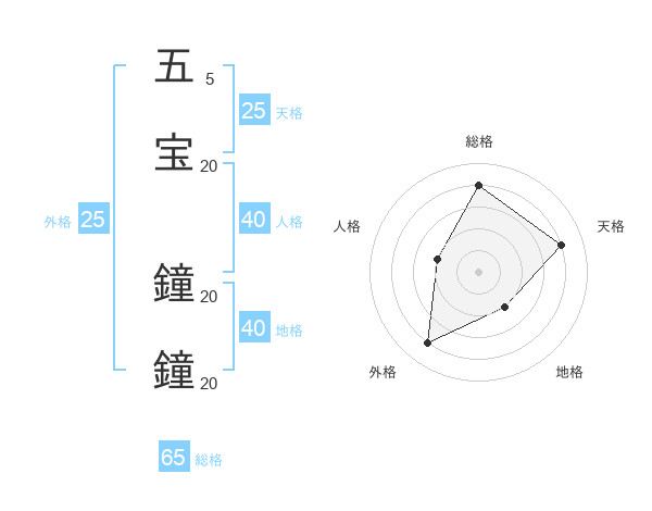 五宝 鐘鐘さんの総格は65画の4点!