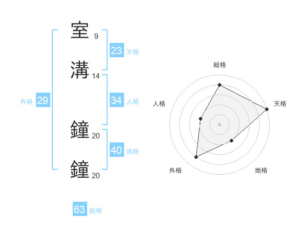 室溝 鐘鐘さんの総格は63画の4点!
