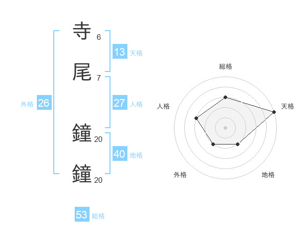 寺尾 鐘鐘さんの総格は53画の3点!
