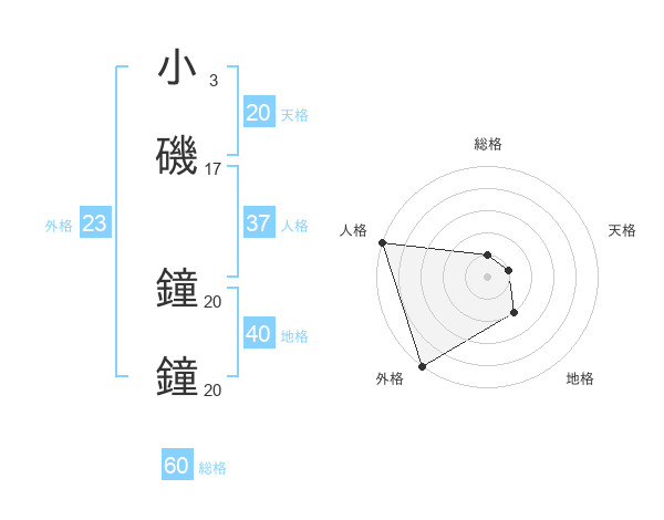 小磯 鐘鐘さんを姓名の画数から五運を鑑定