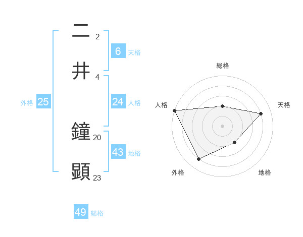 二井 鐘顕さんの総格は49画の2点!