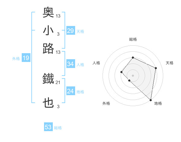 奥小路 鐡也さんの総格は53画の3点!