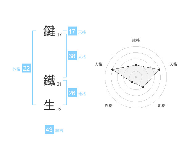 鍵 鐡生さんの総格は43画の2点!