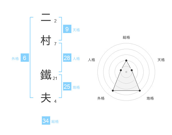 二村 鐵夫さんの総格は34画の2点!