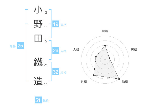 小野田 鐵造さんの総格は51画の3点!