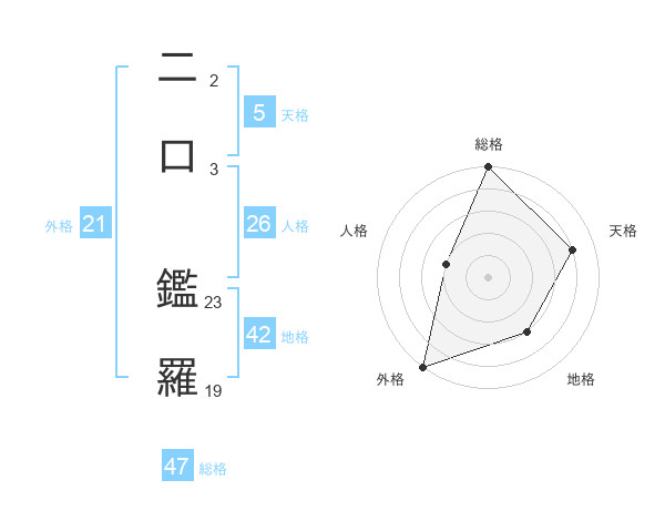 二口 鑑羅さんを姓名の画数から五運を鑑定