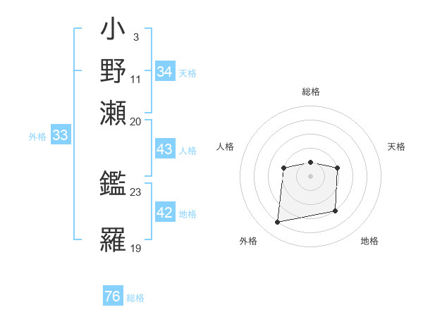 小野瀬 鑑羅さんを姓名の画数から五運を鑑定