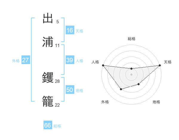 出浦 钁籠さんの総格は66画の1点!