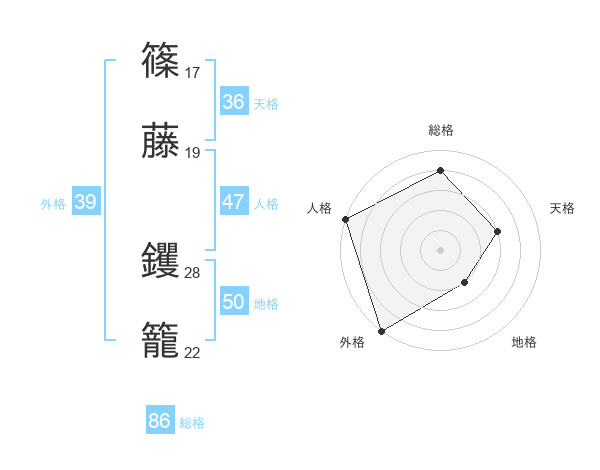 篠藤 钁籠さんの総格は86画の4点!