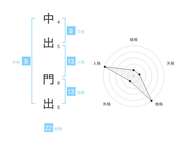 中出 門出さんの地格は13画の5点!