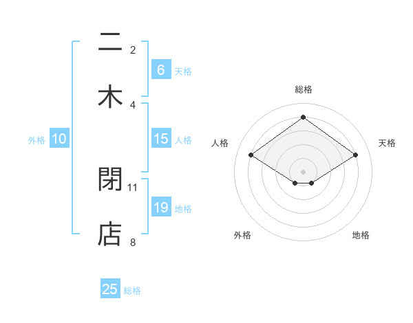 二木 閉店さんの総格は25画の4点!