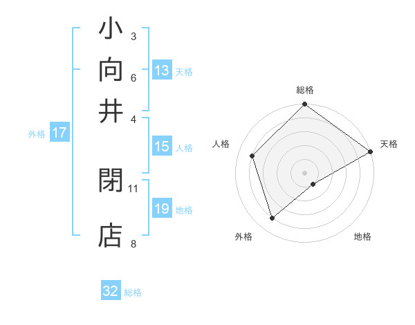 小向井 閉店さんの天格は13画の5点!