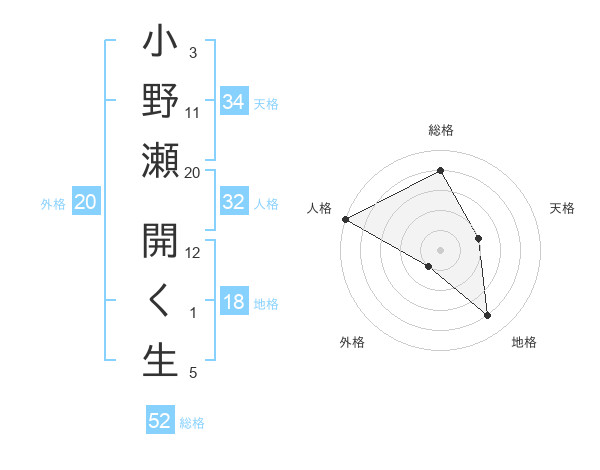 小野瀬 開く生さんを姓名の画数から五運を鑑定
