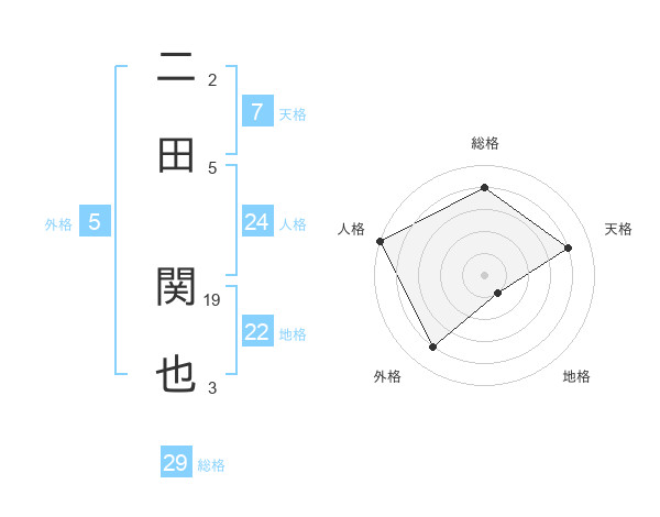 二田 関也さんの総格は29画の4点!