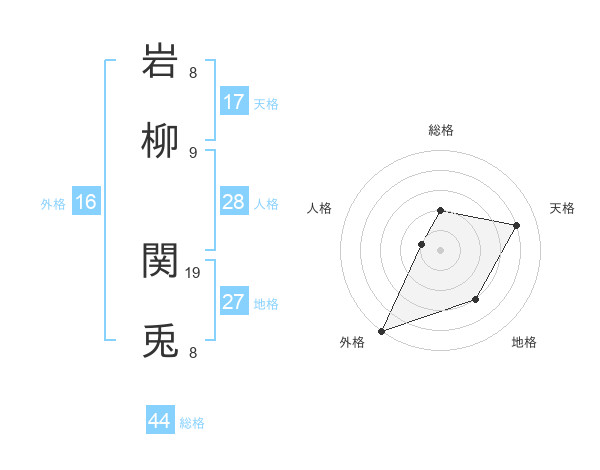 岩柳 関兎さんの総格は44画の2点!