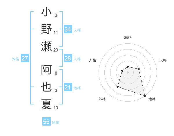 小野瀬 阿也夏さんを姓名の画数から五運を鑑定