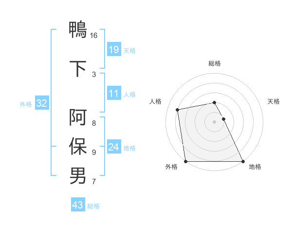 鴨下 阿保男さんを姓名の画数から五運を鑑定