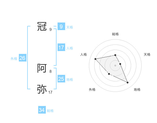 冠 阿弥さんの総格は34画の2点!