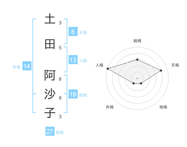 土田 阿沙子さんを姓名の画数から五運を鑑定