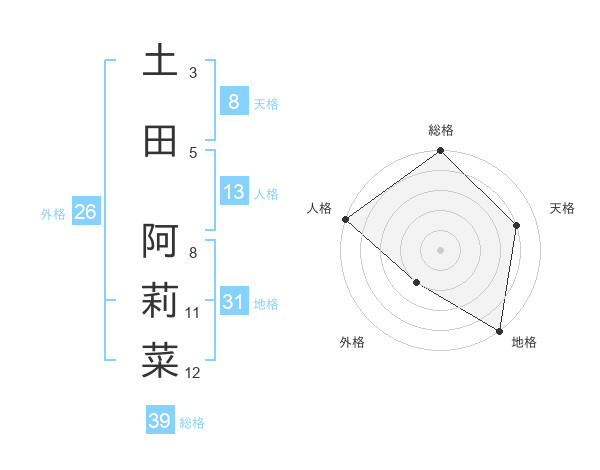 土田 阿莉菜さんを姓名の画数から五運を鑑定