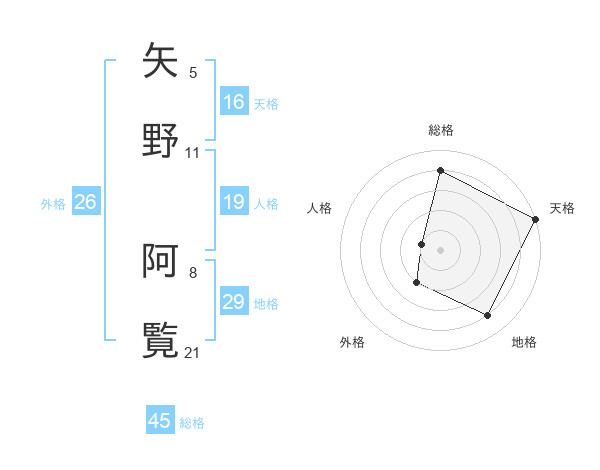 矢野 阿覧さんを姓名の画数から五運を鑑定