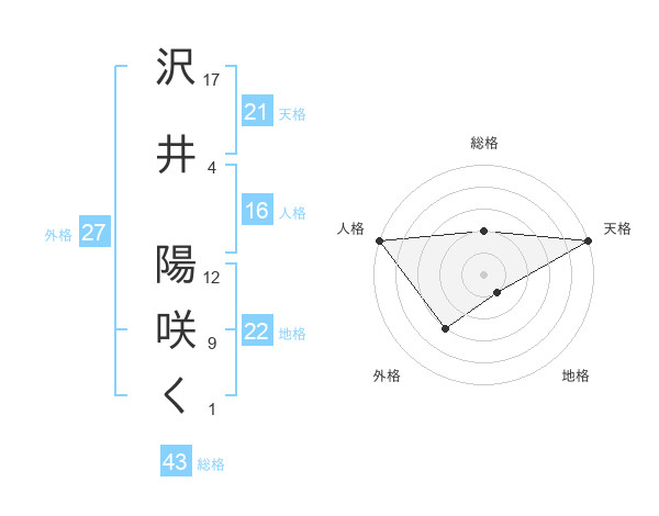 沢井 陽咲くさんを姓名の画数から五運を鑑定