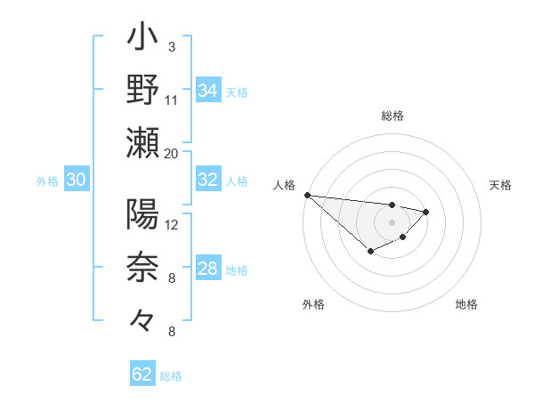 小野瀬 陽奈々さんの総格は62画の1点!