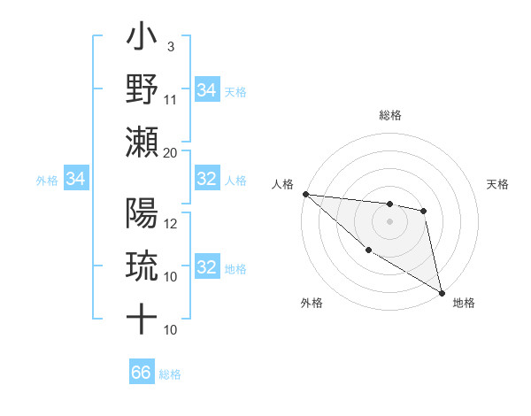 小野瀬 陽琉十さんの天格は34画の2点!