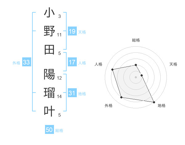 小野田 陽瑠叶さんの総格は50画の2点!